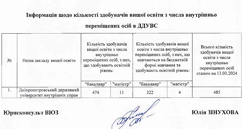 Щодо актуальної кількості студентів з числа внутрішньо переміщених осіб, які навчаються у Дніпропетровському державному університеті внутрішніх справ, ми отримали наступні дані. В університеті навчається 485 осіб, з яких 474 студентів здобувають освітній рівень «бакалавр», а 11 студентів – «магістр». Зазначено, що з них 322 студентів навчаються на бюджетній формі навчання (318 студентів-бакалаврів та 4 – магістрів).