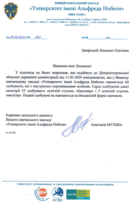 В Університеті імені Альфреда Нобеля навчання доступне виключно на умовах контракту. У цьому закладі навчається 60 внутрішньо переміщених осіб, з яких 55 отримують освітню ступінь «бакалавр», а 5 – «магістр».