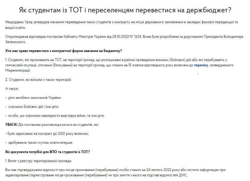 Відповідно до постанови уряду, студенти з ТОТ, а також діти загиблих захисників України та особи, які постраждали внаслідок війни, можуть навчатися за рахунок державного бюджету.