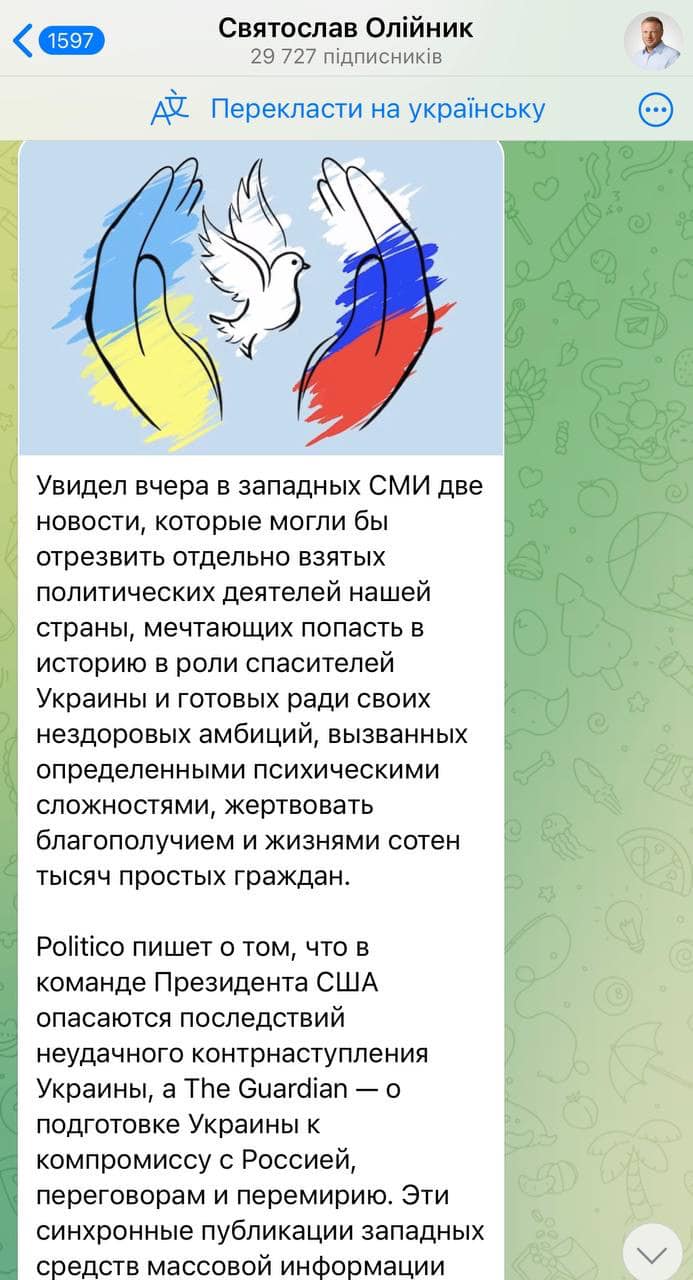 Сам Святослав Олійник 5 травня прояснив ситуацію. Він повідомив 9 каналу, що не веде ніяких акаунтів у соцмережах, а скрін з дописом про необхідність переговорів з росією є фейком.