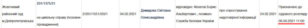 Справа № 201/1375/21 призначена Жовтневим районним судом м. Дніпропетровська до слухання на 11:00 06 квітня.