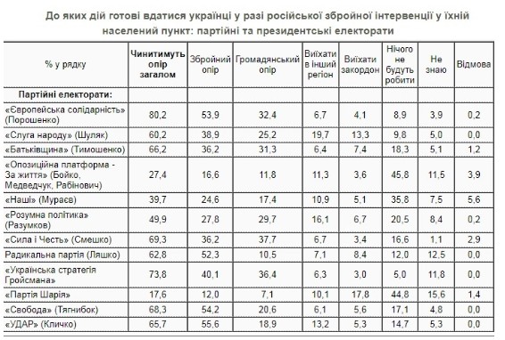 Паніотто також пояснив різкий стрибок готових чинити опір серед прихильників партії Мураєва – за його словами, це пов’язано з відносною непопулярністю політсили. Чим менший у партії електорат, тим більшою буде статистична похибка в результатах опитування.