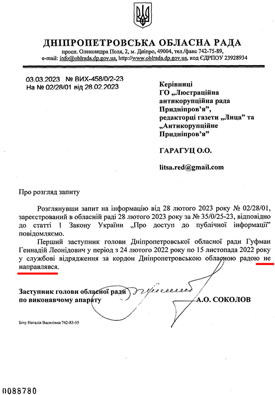 ГО «ЛАРП» звернулося з інформзапитом також до Дніпропетровської обласної ради. Звідти повідомили, що не відряджали Гуфмана за кордон.