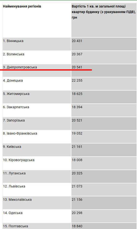 «Для Дніпропетровської області вартість будівництва 1 кв. м становить 20.541 грн з ПДВ. Середній показник по Україні – 21.188 грн», – акцентує журналіст.